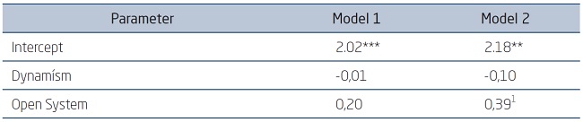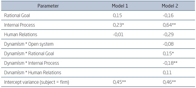The influence of the Internal Process role (0,23; p < 0,10) on the change-consolidation axis is significant and the Open System role (0,20; p = 0,11) is a best linear unbiased estimate. When dynamism increases, the estimate of the product score with the Open System roles is not significant (-0,08; p = 0,33); the product score of the Internal Process role shows a significant negative value (-0,18; p < 0,05), which indicates a substantial inhibition of the contribution.