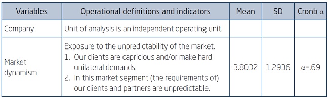 We build on ecological logic that species, with their functionalities, fit in appropriate environments or niches. Some niches are more favorable than others, resulting in better performance when the environment fits to the species. The environment in an ecosystem is characterized by three elements: temporal variation (unpredictability), climatic conditions (tolerance) and spatial heterogeneity (complexity) (Begon et al., 1996). The same elements can be found in management literature: temporal variation is found as dynamism (unpredictability), climatic condition as hostility (tolerance), and spatial heterogeneity as complexity (heterogeneity) (Dess & Beard, 1984; Luo & Peng, 1999). The measure of dynamism as formulated by Luo and Peng (1999), forms the market characteristic in the present study.