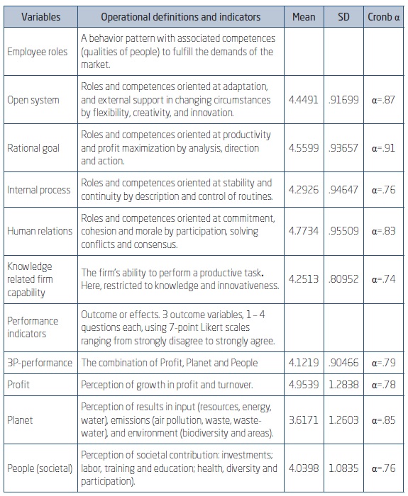 The research uses a cross-sectional design. In order to test the model empirically, the factors derived from literature were operationalized in a survey questionnaire and pretested separately, using existing scales from respective research. Because hard data in SME’s are not always available, we used the respondents’ perception in a seven-point Likert scale from 1-7. Factor analysis confirmed the constructs. In our dataset the reliability of the Quinn roles has a Cronbach α between.76 and.91. For market dynamism the items from Luo and Peng (1999) were refined according to the factor analyses (Cronbach α.69). The dependent variable performance was measured as perceived profit performance (Cronbach α.79). The construct for capabilities consists of perceived results on knowledge and innovativeness (Cronbach α.74). The research variables, definitions and measurement, means, standard deviations and Cronbach α are specified in Appendix 1.