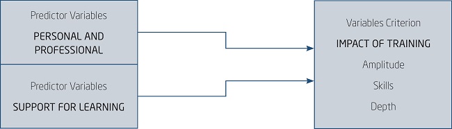 The following predictors were tested: 1. clientele profile, which contains the biographical and functional information regarding the participants of the two training sessions under analysis; 2. learning support (psychosocial support of colleagues and leadership to the application of new learning in work performance).