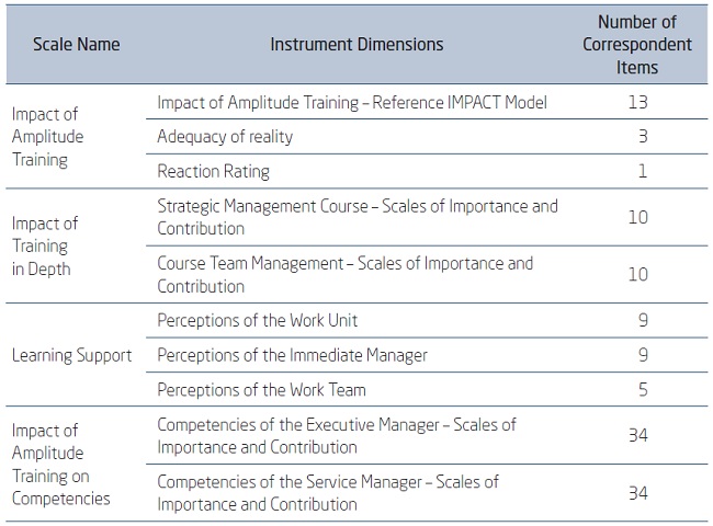The amplitude impact assessment contains items related to the frequency of use of learning, improvement of the quality of task performance, reduction of errors in the execution of the task and items that evaluate the impact of training on the motivation and self-efficacy of the trained professional. The in-depth impact assessment has items drawn from the instructional objectives (transformed into expected performance objectives) specific to each training.