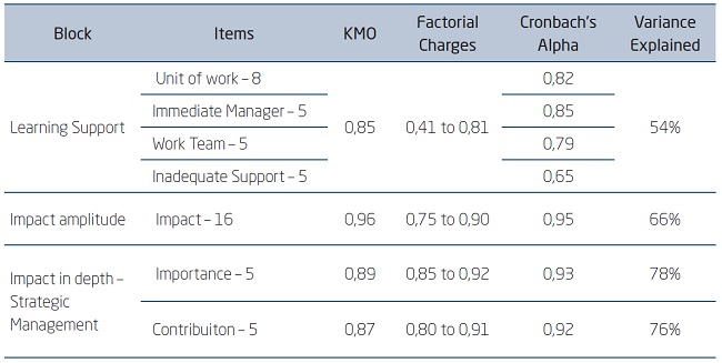 According to Hair Junior, Black, Babin, Anderson, & Tatham (2006), it is important to point out that the criterion used for eigenvalues must have at least one associated eigenvalue equal to 1. The tested rotation between the factors for each dimension (learning support and impacts) was Varimax. Table 4.1.1. shows the psychometric indicators of each block.