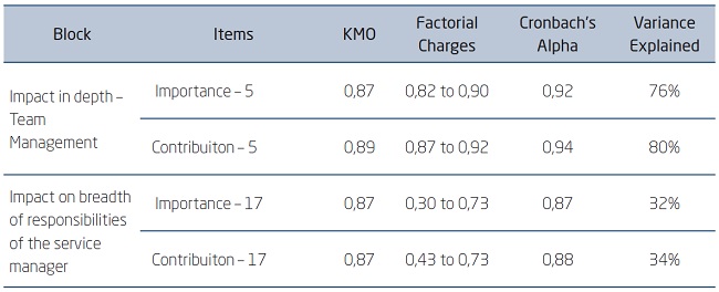 In Appendix I, we present parts of the factorial loads of each research block, describing the items of learning support, impact on breadth, depth of impact, and breadth of impact on the competencies of the service manager.