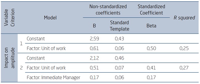 We present here the empirical results obtained with the statistical regression models, which are separated by the variable training impact criterion and the predictive variable of learning support with their respective factors of the work unit, immediate manager, work team and support. In Tables 3 to 6, the final and significant results of such models generated in the SPSS are synthesized, using as a criterion of permanence in the model the probability values of F <0.05, starting with the Impact in Amplitude criterion.