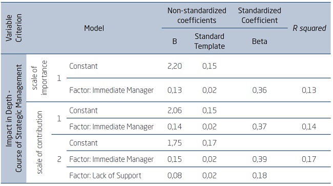 The final model indicated that only the learning support of the immediate manager was able to significantly predict the impact in depth in the distance course of strategic management in terms of its importance for the development of professional skills oriented to the manager's job performance. It also indicated that the support to the immediate manager's learning and the lack of support significantly predicted the impact in depth in the strategic management course, in terms of their perceived contribution to the acquisition and mastery of professional skills oriented to the manager's job performance.