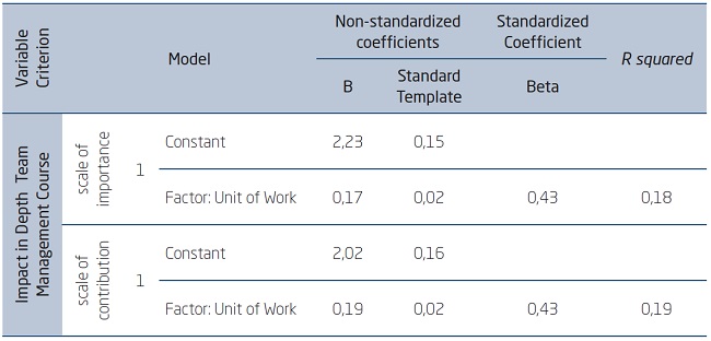 In the distance course of team management, it was verified that the only predictor identified for the variable criterion was the support to the perceived learning in the work unit, in the importance and contribution scales, as shown in Table 4.2.3.