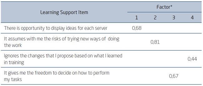 For a better understanding of the factorial analyzes carried out in this research, it is shown that the learning support block presents values not so close to 0 and not as close to 1 in the analysis of the commonality matrix, characterizing a satisfactory factorial solution. The component matrix identified in the learning support block is formed by the four factors: 1. Work Unit, 2. Immediate Manager, 3. Work Team, and 4. Inadequate Support; that explain 54% of the variance already mentioned, generating factorial loads between 0.13 and 0.81; the partial results of which are given in Table 1 of Appendix I.
