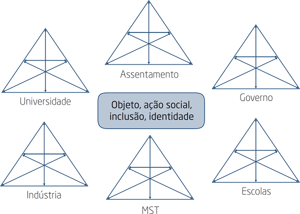 And following the object of the bakery activity system, it was possible to perceive that object and motive are re-conceptualized to reach a wider horizon of possibilities, leading the activity to an expansive transformation, in order to respond to the impacts of the other activity systems that, together, have been composing the social context where the practice takes place. The reason, the sense of the activity and the participation of these women, materialized in the object - baking industry - becomes an outcome and both are absorbed by other systems. In understanding the multiple perspectives and networks of interactive systems, the objects of the activity systems, upon receiving the outcomes of the bakery system, claim the ideals of the agrarian reform. Because of the objective (motive) of each system, contradictions are the way of pushing systems to evolve in the quest to keep their objects alive, guiding subjects to act in the world. It is a network of interconnected activity systems that will combine their objects to generate a shared object that we call the ideal of the agrarian reform (Engeström & Sannino, 2010).