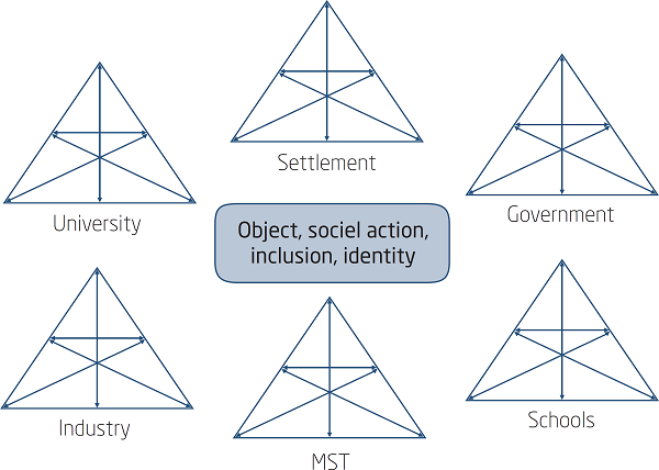 At this point, we see the justification for choosing this approach for the study of learning in the productive group. Based on the dialectics of the rise from the abstract to the concrete, ELT can provide us with a structure to analyse the interaction between the object under construction, the mediating artifacts, and the different perspectives of the participants in a progression of actions that have been and are being carried out collectively (Engeström, 2008).