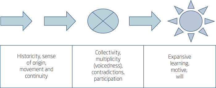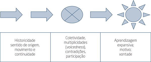 Yrjo Engeström develops his studies by giving them the name of Expansive Learning Theory (ELT), arguing that human beings and their collectives, regardless of age, are creators of a new culture and learn through expansion (Engeström, 1987). It focuses on the learning processes in which the subject of learning per se is transformed from a system of collective activity or from a network of activity systems. By questioning the existing order and logic of their activity, in a collaborative analysis, they give rise to the formation of a new object and a new pattern of activity, in a developmental logic based on the resolution of their internal contradictions. In expansive learning, a simple initial idea is transformed into a complex object, into a new form of practice (Engeström & Sannino, 2012).