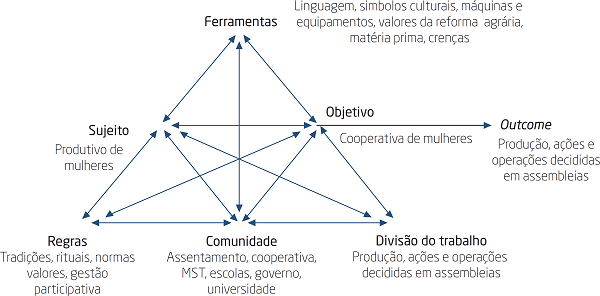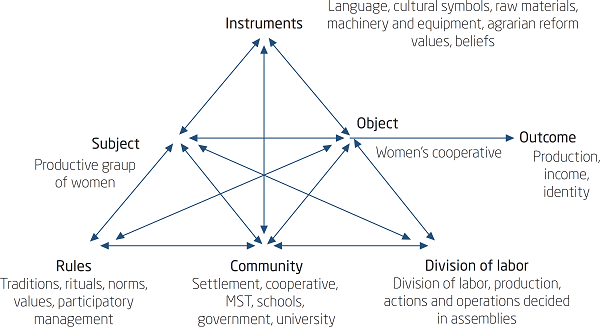 The women's actions and operations transform the object into result (the reason for the activity) through material mediation artefacts - tools, instruments, machines - and symbolic - signs, language - that are used to manipulate and understand the object. This object has social consequences, so it is mediated by rules and norms that mediate the relation of these women with the community and this will relate to the object through the division of the work.