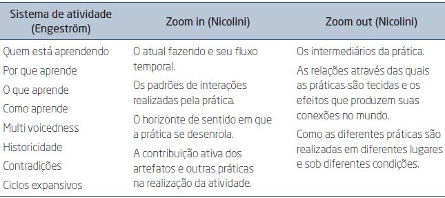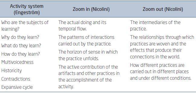 In addition, specific aspects suggested by Nicolini (2009) were incorporated, that seek to identify 1. the actual doing and its temporal flow, 2. the interaction patterns performed by the practice, 3. the horizon of sense and the concern in which the practice unfolds and 4. the active contribution of the artefacts and other practices in the accomplishment of the activity in question. This search led to the adoption of a recursive movement of zooming in and zooming out, promoting a convincing and meaningful description of what the practice is, why it is the way it is and why it is not done differently, guiding the researcher's gaze through questions a priori.