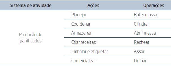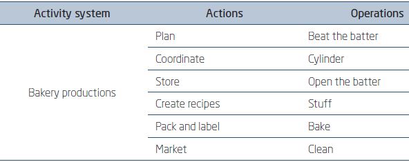 In relation to the hierarchical levels of activity, we have at the level of activity - bakery production - at the level of actions - to plan the production, coordinate, store, label, pack, and create recipes - and at the level of operations - mix the dough, rolling, opening the dough, stuffing, baking, cleaning, etc. - a series of routines, subordinated to goals and oriented to a collective motive. These routines are known by everything that they pass on to the others, the guidelines necessary for the execution of the operations.