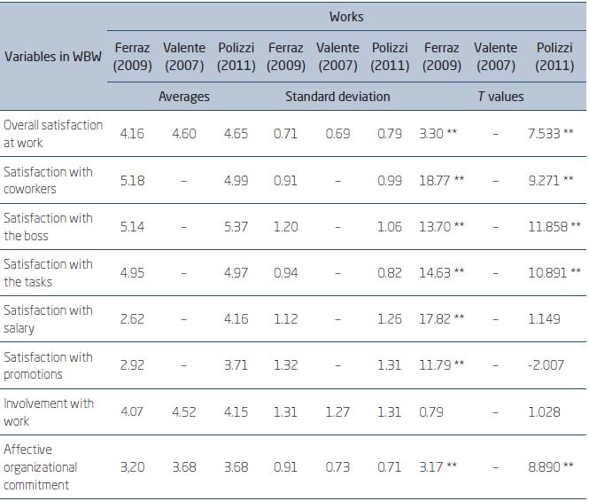 Still, in the comparison of the three studies, there is a possibility of assuming the same gaps in the three studies, that is, the dissatisfaction with work, provoked by the policies of people management; and medium indexes of involvement with work and affective bond with the organization. This assumption is reinforced by the results of this study and Ferraz (2009), who pointed to satisfaction with colleagues, management, and tasks, but dissatisfaction with salaries and promotions, resulting from the analysis of the five well-being factors at work.