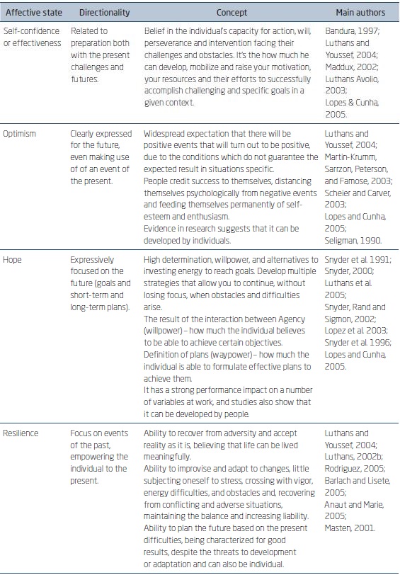 The four dimensions of PsyCap (self-confidence or self-efficacy, hope, optimism, and resilience) were scientifically specified, based on theoretical knowledge studies and solid empirical research by Luthans and his collaborators in isolated research in organizations and then assembled in an absolute form in the proposition of the PsyCap concept. Finally, positive psychology investigates the construction, reinforcement, promotion of human capabilities and forces which are measurable (Luthiers, 2002a). It is important to emphasize the existence of a possible overlap in the limits in the summaries of the presented definitions. Thus, for a still further understanding, it will be presented Figure 2.3, with the synthesis of the four dimensions of the concept.