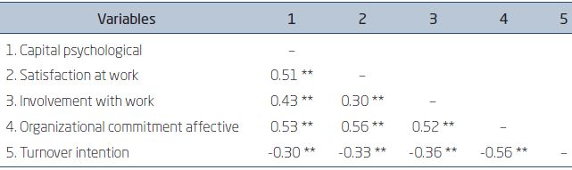 The results ranged from r = -0.30 to r = 0.56, and the highest correlation coefficient found was in the ranged variables, Organizational Commitment affective, Satisfaction at work (r = 0.56; p < 0.01) and the lowest between TI and PsyCap (r = -0.56, p <0.01).