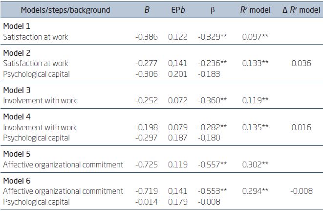 In the third model for involvement with work, the power of explanation was 11.9% in TI (R² = 0.119; F (1.83) = 12.345; p <0.01), that is, it explains more than the dimension satisfaction at work. In the fourth model, PsyCap added to engagement with the work and obtained a 13.5% explanation capacity (R² = 0.135; F (2,82) = 7.558, p <0.01) augment of 1, 6% in the explanation (ΔR² = 0.016).