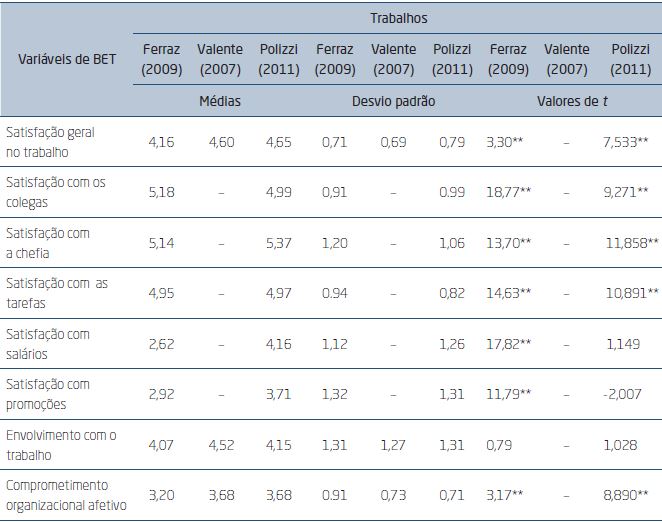 Still, in the comparison of the three studies, there is a possibility of assuming the same gaps in the three studies, that is, the dissatisfaction with work, provoked by the policies of people management; and medium indexes of involvement with work and affective bond with the organization. This assumption is reinforced by the results of this study and Ferraz (2009), who pointed to satisfaction with colleagues, management, and tasks, but dissatisfaction with salaries and promotions, resulting from the analysis of the five well-being factors at work.