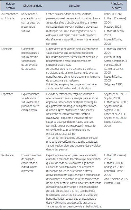 The concept of PsyCap emerges in the international literature as a relevant perspective to the research of topics in the business management of people. Its comprehensive features and structure can help in the development and training of human resources in organizations, which in turn can turn into a resource to be used in the fierce competitiveness of the educational market.