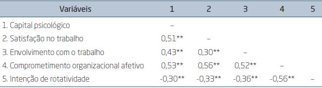 When analyzing the other correlations, it is noted that all WBW dimensions had a positive correlation with PsyCap, with all indexes reaching moderate correlation values. PsyCap presented positive, significant and moderate correlation with satisfaction at work (r = 0 , 51, p <0.01); with involvement with work (r = 0.43, p <0.01) and with affective organizational impairment (r = 0.53, p <0.01). These results imply saying that PsyCap is higher, increase in proportion to the indicators of WBW. Thus, it is observed that PsyCap patients maintain a positive level of health at work, which is represented by WBW.