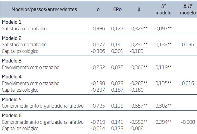 In the fifth model, affective organizational compromise presented the highest of the results, explaining 30.2% (R² = 0.302, F (1.83) = 37.344, p <0.01) in the TI. Finally, in the sixth and last regression model for affective organizational impairment with the inclusion of PsyCap, the explanatory power was 29.4% (R² = 0.294, F (2.82) = 18.452, p <0.0). In this case, it is the only the WBW dimension that had its impact reduced by PsyCap (ΔR² = -0.008), although by a small percentage of 0.8 %.