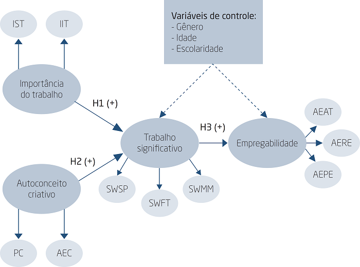 Resultados: Os dez construtos usados no modelo apresentaram validade convergente, validade discriminante e confiabilidade adequadas. No modelo estrutural, as três hipóteses foram confirmadas, de modo que o autoconceito criativo e a importância do trabalho explicam 68% da va- riância do trabalho significativo, e, por sua vez, o trabalho significativo explica 67% da variância da empregabilidade; em ambos os casos, o poder explicativo é grande para os padrões da área de ciências do comportamento. Este estudo contribui, sobretudo, para elucidar a importância do trabalho significativo em programas de orientação da carreira para pessoas em situação de desemprego. Parece útil indicar orientação de carreira centrada no trabalho significativo com vistas a aumentar a empregabilidade, já que indivíduos com autoavaliações positivas são mais prováveis de obter sucessos de carreira a partir do esforço pessoal. Nacionalmente, tais conhecimentos poderão fomentar programas de políticas públicas voltadas para o desenvolvimento de pessoas em situação de desemprego centradas na orientação de carreira.