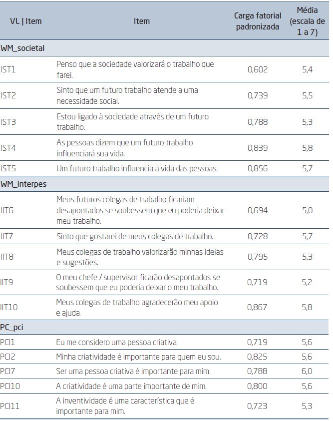 Originalidade/valor: Este estudo contribui ainda para a literatura oferecendo três novos instrumentos de medida válidos e fidedignos para os construtos: autoconceito criativo, importância do trabalho e trabalho significativo.