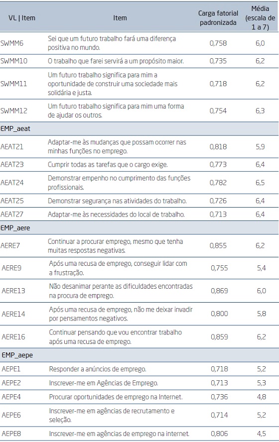 Furthermore, the employability scale was used: Self-Efficacy in Transition to Work (AETT) was created and validated by Vieira and Coimbra (2006) and Vieira et al. (2007) already used in employed and unemployed people and college students by Gomes (2014) and adjusted to the Brazilian culture by the Onça (2017) in a sample of unemployed individuals. Originally, the scale has 28 items. In this study we used 15 items related to three dimensions: 1. self-efficacy in adaptation to work: (five items), 2. self-efficacy in emotional regulation (five items), and 3. self-efficacy in job search (five items). The scale uses 7 points varying: from 1 = "not confident at all" to 7 = "very confident".