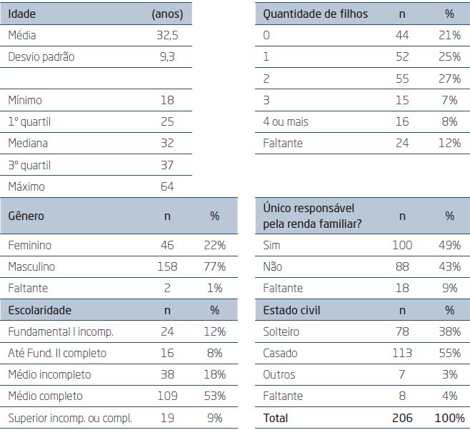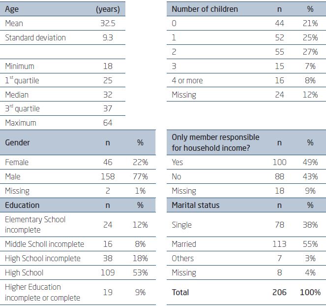 Figure 7.1.1 presents the characteristics of participants in this survey, which are resumed as follows: 1. adults with an average age of 32.5 years, with the 1st quartile equal to 25 years old and the 3rd quartile equal to 37 years old (50% central); 2. majority male (77%); 3. high school (53%); 4. married (55%); 5. have one or two children (52%); 6. half of them are solely responsible for household income.