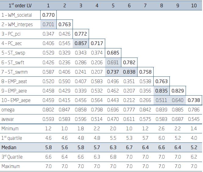Finally, the reliability is suitable for all LVs, with omega equal to or greater than 0.7. It is important to note that the AVE and the omega results could be improved by eliminating items with lower factor loadings, but this would hinder the content validity and comparability of the current results with a previous survey (DeVellis, 2016), so all 48 initial items were kept in all models tested.
