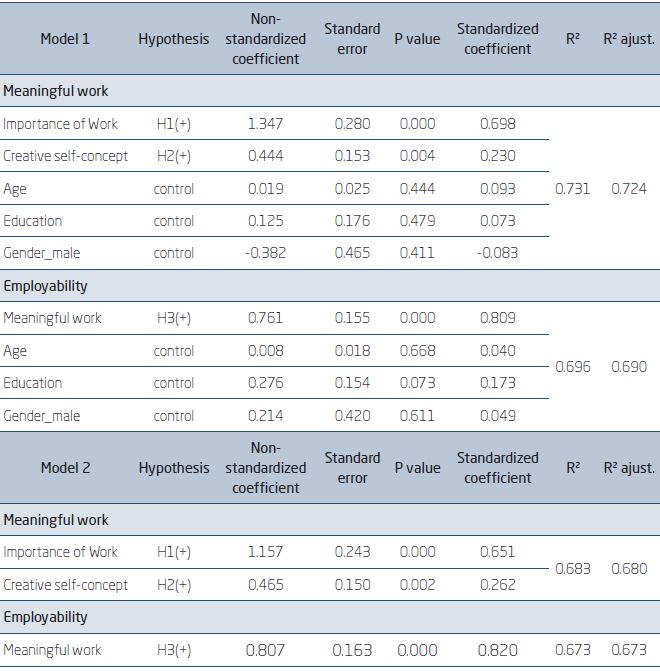 Both model 1 and model 2 confirmed the three hypotheses, so creative self-concept and importance of work explain 68% of the variance in meaningful work and, on its turn, meaningful work explain 67% of the variance in employability, in both cases the explanatory power is great for behavioral science standards (Cohen, 1988).