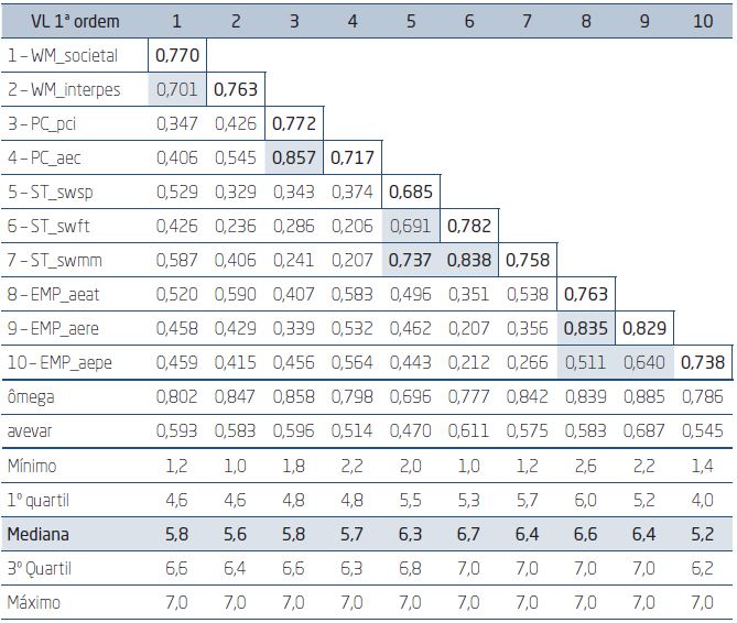 Figure 7.2.1 presents the results of the CFA with ten first-order LVs. The model showed proper adjustment indices (GoF), as presented in the footnote of Figure 7.2.1. The convergence validity was deemed adequate, as the AVE values are higher than 0.5, except for LV ST_swsp (positive Meaning, the dimension of the meaningful work), which came to a close value (0.47).