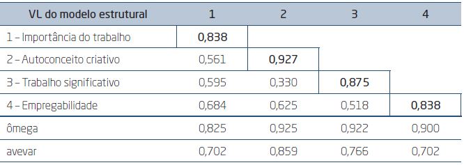 The second CFA included the four second-order LV, composing the structural model, namely: Importance of Work, Creative self-concept, Meaningful work, and Employability. The results presented in Figure 7.2.2 are adequate in all criteria: GoF, convergence validity (AVE > 0.5), discriminant validity (values outside the diagonal are smaller than the diagonal values), and reliability (omega > 0.7).