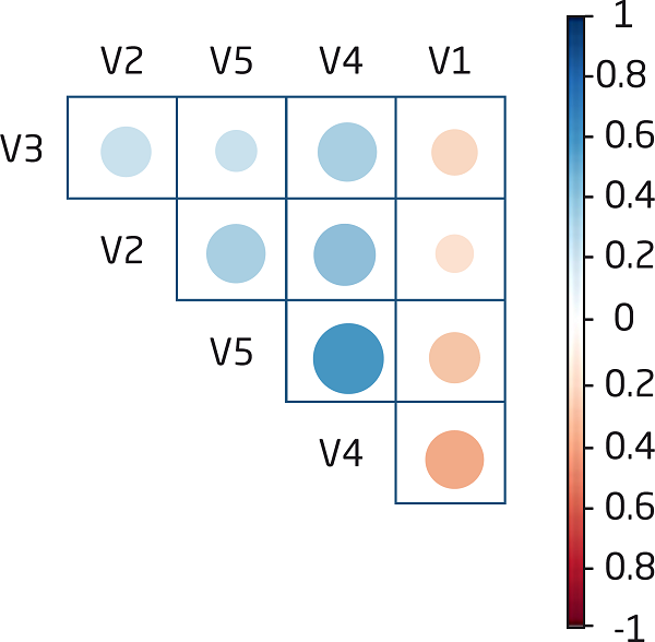 Therefore, understanding both phenomena not only relate to each other but are also influenced by personal and organizational aspects, an assertive investigation of the relation between presenteeism and cooperation required the variables combination associated to them - V1, V2 and V3 - to the variables associated to organizational and personal influential factors - V4 and V5. Hence, the correlation technique was applied in order to better understand the relation between dimensions of interest and dimensions of influence. Figure 4.3.1 presents the results of the correlations. It is important to emphasize that the exposed relations are directly proportional, when represented in blue, and inversely proportional, when represented in red. Likewise, the intensity of the correlation is represented by the size of the points.