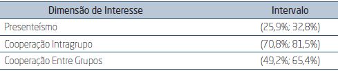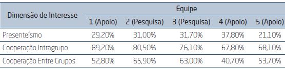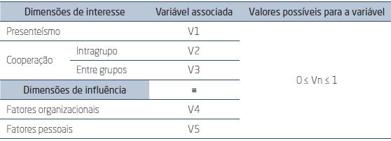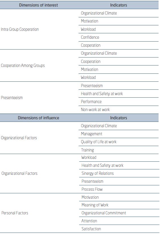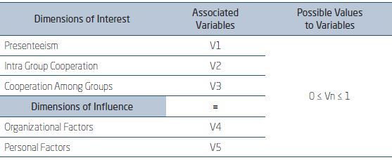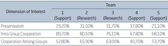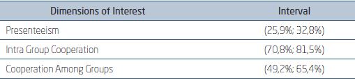 Dimensions of interest: The study assumed presenteeism and cooperation as the two dimensions of interest. However, considering the cooperation range, it was considered pertinent that investigations should be more specific. Therefore, by methodological criteria, the cooperation dimension was subdivided into separated dimensions, namely: intra group cooperation and cooperation among groups. In this way, the subdivision enabled to consider three dimensions of interest: presenteeism, intra group cooperation and cooperation among groups.