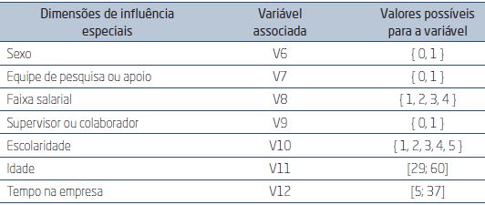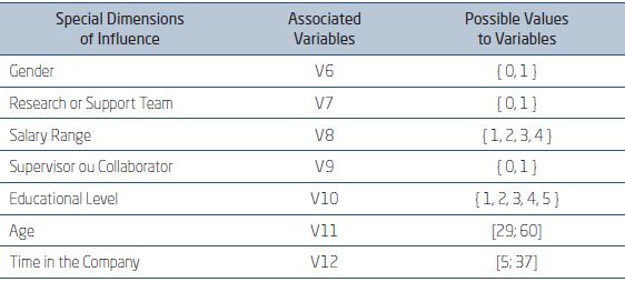 Consolidation of the variables associated to the data provided by the organization: In addition to the data collected by the questionnaire, the study also added to the analysis some sociodemographic data about the participants that were made available by the organization, considering them also influential in presenteeism and cooperation. Thus, since they demanded a different methodological treatment related to the other dimensions, the sociodemographic data were tabulated and considered as seven special dimensions of influence. From each of them, numerical variables were consolidated in order to make possible analysis and statistical processing with other dimensions and their associated variables. Figure 3.3.3 presents the seven special dimensions of influence and their associated numerical variables.