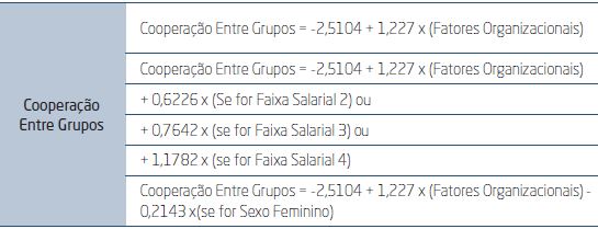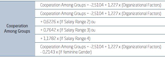 Furthermore, salary range also consists in an influential dimension on the cooperation among groups. The model demonstrates that the intensity of this relation increases as the salary increases, indicating that individuals with higher remuneration tend to be more satisfied with the cooperation among groups. Likewise, in the organization studied, women tend to be less satisfied with the level of cooperation among groups, since the model also represents gender as an influential factor on this dimension of interest.