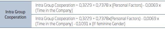 As well as the presenteeism model, time in the company also consists in an influential factor on the level of cooperation. It means that cooperation assessment decreases as the time in the company increases. According to the model (Figure 4.4.2), gender also appears as a dimension of influence. It is observed that women tend to evaluate intra group cooperation at a lower level than men, which could mean that, in this organization, women tend to be less satisfied with their group’s cooperative environment.