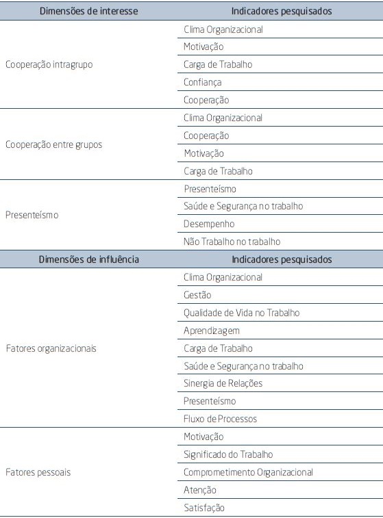 Adopting an exploratory nature, this research aimed to diagnose the organizational reality in terms of presenteeism and cooperation. The proposed assessment looked for the following results: