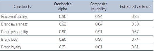 The intention of individually validating the constructs is to validate the model integrated with its respective constructs (Hair et al., 2010; Kline, 2011). For the individual validation of the constructs, the unidimensionality, reliability, convergent validity, and discriminant validity were analyzed. To verify the unidimensionality of the constructs, we proceed with the exploratory factor analysis (EFA) through principal components and by means of the Varimax orthogonal rotation, being the factor loads of EFA considered satisfactory, because they presented values above 0.50, which is considered very good (Hair et al., 2010). Furthermore, the values of the explained variance showed a minimum value of 70.50% (0.705). It was also verified that the Cronbach’s alpha and the composite reliability showed minimum values of 0.630 and 0.810, where values higher than or equal to 0.70 are suggested or higher than 0.6 (Hair et al., 2010; Malhotra et al., 2012).