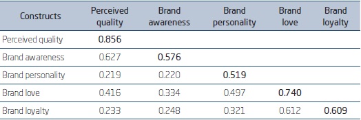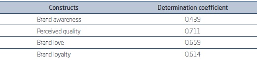 Based on data presented in Figure 4.3.3, the determinants (or antecedents) of customers brand loyalty of the soft drink Guaraná Jesus have presented a determination coefficient (R²) of 0.614, that is, 61.4% of brand loyalty of the soft drink investigated (Guaraná Jesus) can be explained by its determinant constructs (perceived quality, brand awareness, brand personality, and brand love). This result is high explanatory power to the constructs tested in the model (Tabachnick & Fidell, 2012).