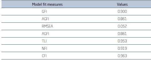 To evaluate the general model fit of the proposed theoretical model and verify if it has adequate representation of the tested relationships, three goodness-of-model fit measures were used, based on the classification of Hair et al. (2010): absolute measure fit (GFI and RMSEA = values between 0.05 and 0.08 are acceptable), incremental measure fit (AGFI, TLI, and NFI) and moderated measure fit (CFI), where values equal to or higher than 0.90 are considered good indexes.