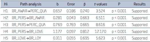 According to the results, the six research hypotheses were statistically supported, being them: H1 (“Brand awareness positively influences customer perceived quality”, β = 0.240, p < 0.001), result found by Rubio et al. (2014) and Sasmita and Suki (2015); H2 (“Brand personality positively influences customer brand awareness”, β = 0.663, p < 0.001), convergent with Su and Tong’s (2015) study; H3 (“Brand personality positively influences customers perceived quality”, β = 0.655, p < 0.001), confirming the results found by Nikhashemi et al. (2017); H4 (“Brand personality positively influences brand love”, β = 0.812, p < 0,001), confirming Dagger and David (2012) and Anggraeni and Rachmanita’s (2015) results; and H5 (“Brand love positively influences customer brand loyalty”, β = 0.695, p < 0,001), as pointed out by Carroll and Ahuvia (2006).