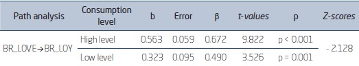 The moderator effect of consumption frequency level was performed through multi-group structural equation modeling, splitting the sample into two groups, being the high level compared to the low level. For so, the comparative tests between groups were performed, by means of the Critical Ratios for Differences between Parameters. It was considered the one indicated by Preacher and Hayes (2004), in which the differences between the groups with Z-scores must be superior to ± 1.96, which indicates a significance level lower than 0.05 (p-value < 0.05) and 95% reliability.
