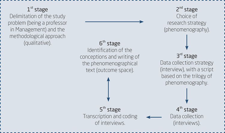 Characterization of the phenomenographical study is the second stage in the methodological trajectory. This comes from the assumption that reality is socially constructed; therefore, an understanding was sought concerning how professors interpret their experiences and construct their worlds, and what meanings are attributed to the experience of being a professor in undergraduate and graduate Management programs.