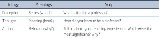 The questions were pre-defined to provide flexibility, such as changing the order of the questions to allow for the dynamic of the interview process. The script was defined based on the trilogy of phenomenography - perception, thought, and action - which can describe the conception of this phenomenon (Cherman & Rocha-Pinto, 2016).