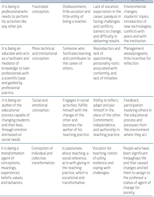 The internal factors perceived in the reports that contributed to this conception involve the career expectation, which was higher than the reality; changes in attitude in the face of challenges and conflicts, as the subjects opted not to oppose them any longer; and barriers to change, as they needed to adapt to new times and were frustrated by not being able to respond. Environmental changes, student styles and the use of new technologies that have changed the professor-student relationship were other factors related to the context of the professor's performance and conflict with peers and teaching institutions.