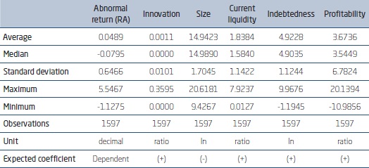 Findings: The results demonstrate a negative and statistically significant relationship between innovation and the abnormal return. That is, current R&D expenses lead to a lower current abnormal return. It could be linked with the fact that R&D expenses tend to produce returns just in longer periods, demanding more time to recover these investments, due to their complex characteristics related to accounting measurement of R&D expenses. Consequently, an abnormal return could be perceived only in subsequent periods.