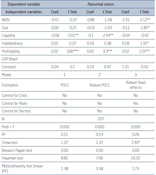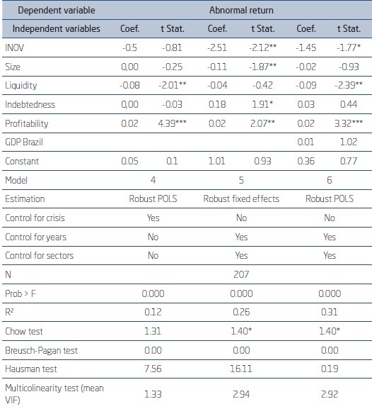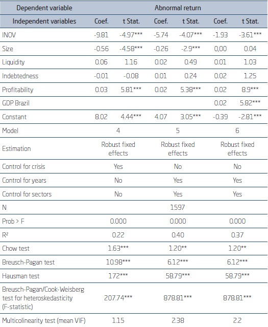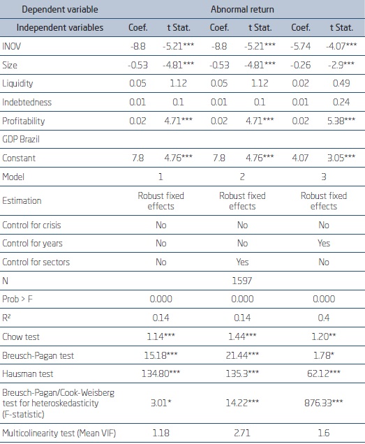 Considering that our research period comprises an economic and political crisis scenario, additional tests with macroeconomic controls corroborate with our previous estimations, demonstrating a negative relationship between innovation and abnormal return. This economic turbulence could lead to the drop in share demand and devaluation of their prices. That is, the actual return tends to be, in fact, lower, decreasing the abnormal return (Lintner, 1965; Sharpe, 1964).