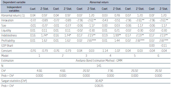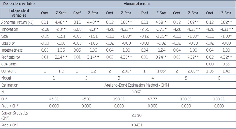 Consequently, we applied Arellano and Bond (1991) estimation method, suitable for the situation in which it is not possible to assure the endogeneity of the explanatory variables of the model, using the abnormal return dependent variable (RA) lagged in a period.